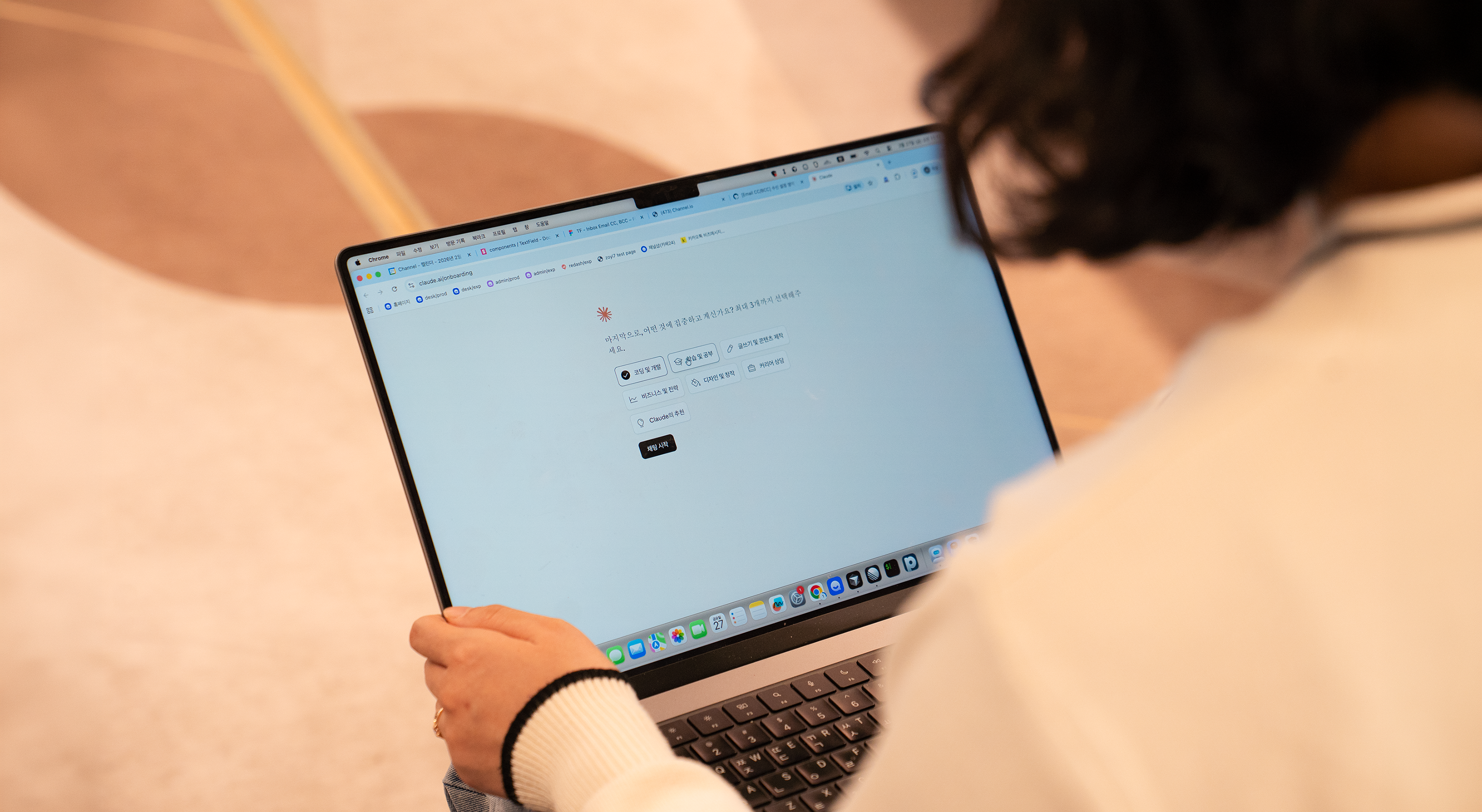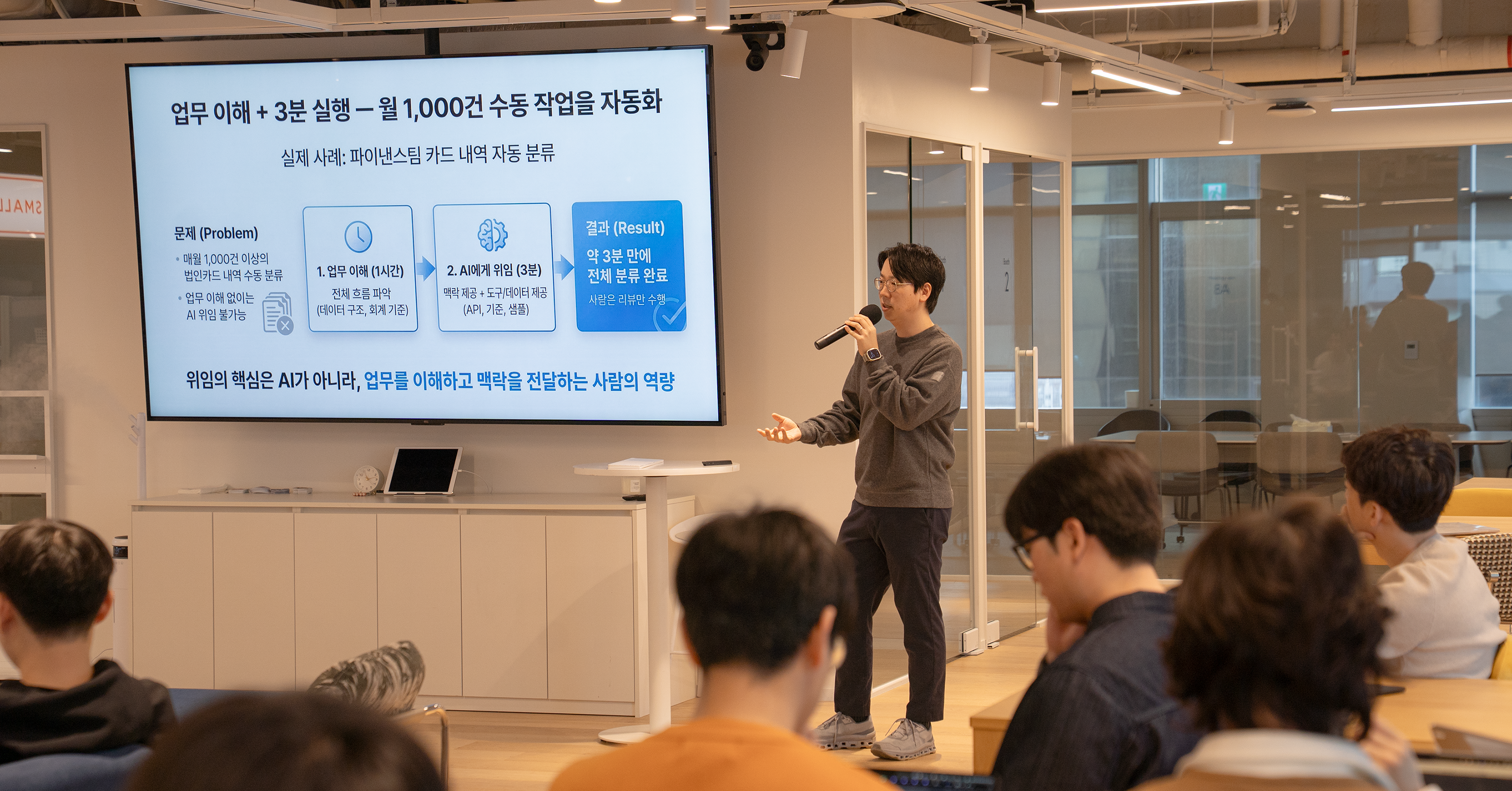 지난 2월 타운홀에서 AI Impact에 대해 강조하는 시간을 가졌습니다. 지난 1월 타운홀에서 CAIO 브라이언이 채널팀 멤버 모두가 클로드 코드를 사용할 것이라고 공유해주셨는데요. 그 일이 실제로 일어났습니다. 채널팀은 AI 구호만 외치지 않고 주도적으로 일하는 방식을 변화시켜 나가고자 합니다. 이를위한 시작으로 AX팀에서 모든 멤버에게 클로드 코드 사용법과 실제 사용 사례를 공유해주었습니다. 채널팀 멤버들이 노트북을 가지고 라운지에 모여 클로드 코드를 직접 활용하면서 익숙해질 수 있는 시간이었습니다. 그리고 제품에 AI를 담는 것 이상으로 우리가 일하는 방식의 혁신이 필요함을 모두가 공감할 수 있었습니다.