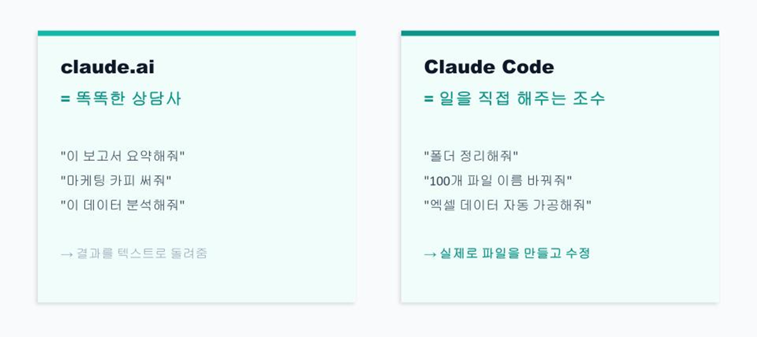 많은 이들이 클로드 AI와 클로드 코드를 혼동하지만 이 둘의 차이는 명확합니다. 클로드 AI가 '방법을 알려주는 AI'라면, 클로드 코드는 '직접 일을 해주는 AI'입니다. 예를 들어, 클로드 AI에게 “파일 정리하는 방법을 알려줘”라고 하면 정리 방법을 설명해 줍니다. 반면 클로드 코드에게 “다운로드 폴더를 날짜별로 정리해 줘”라고 하면 실제로 내 컴퓨터의 파일을 정리해 결과를 만들어 냅니다.