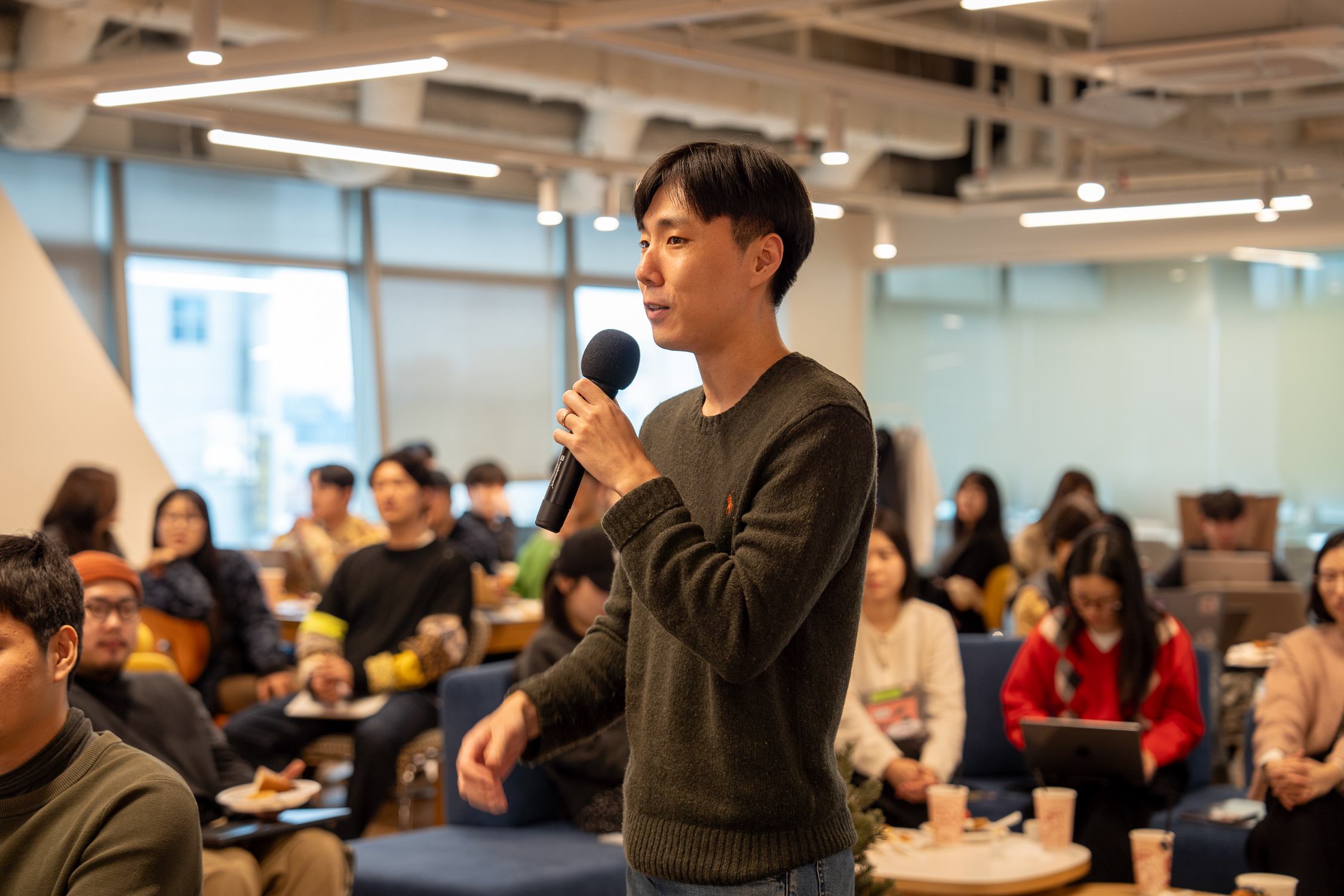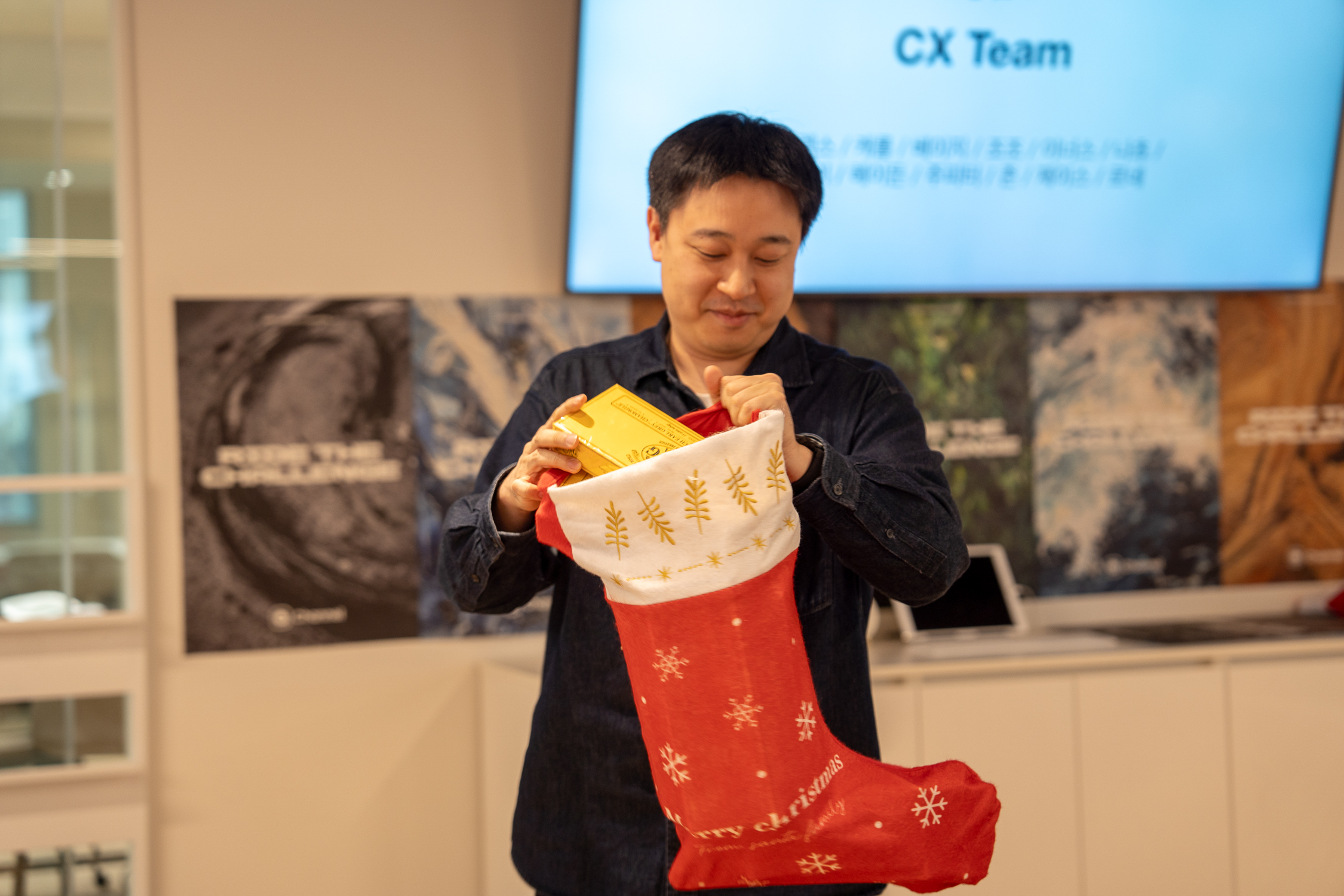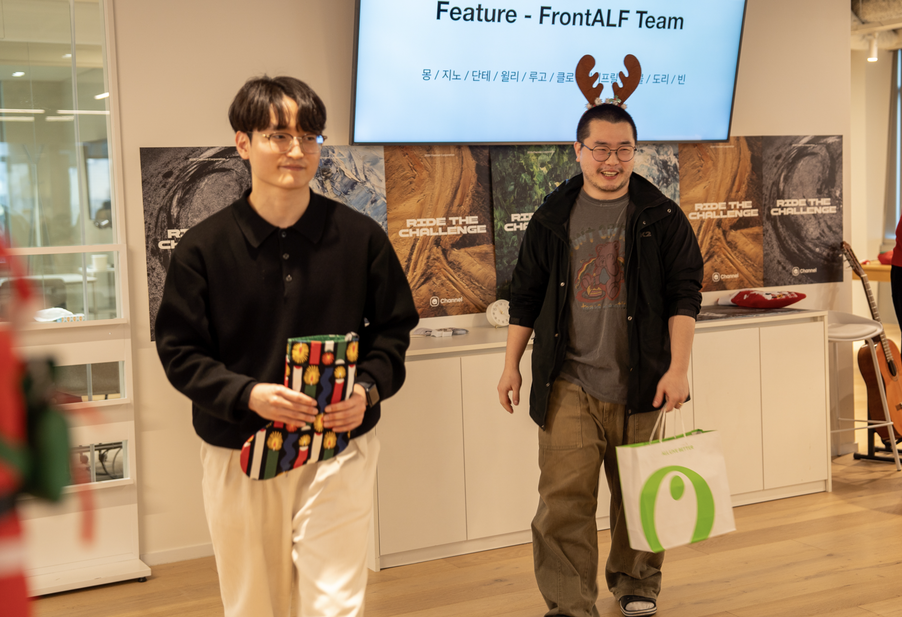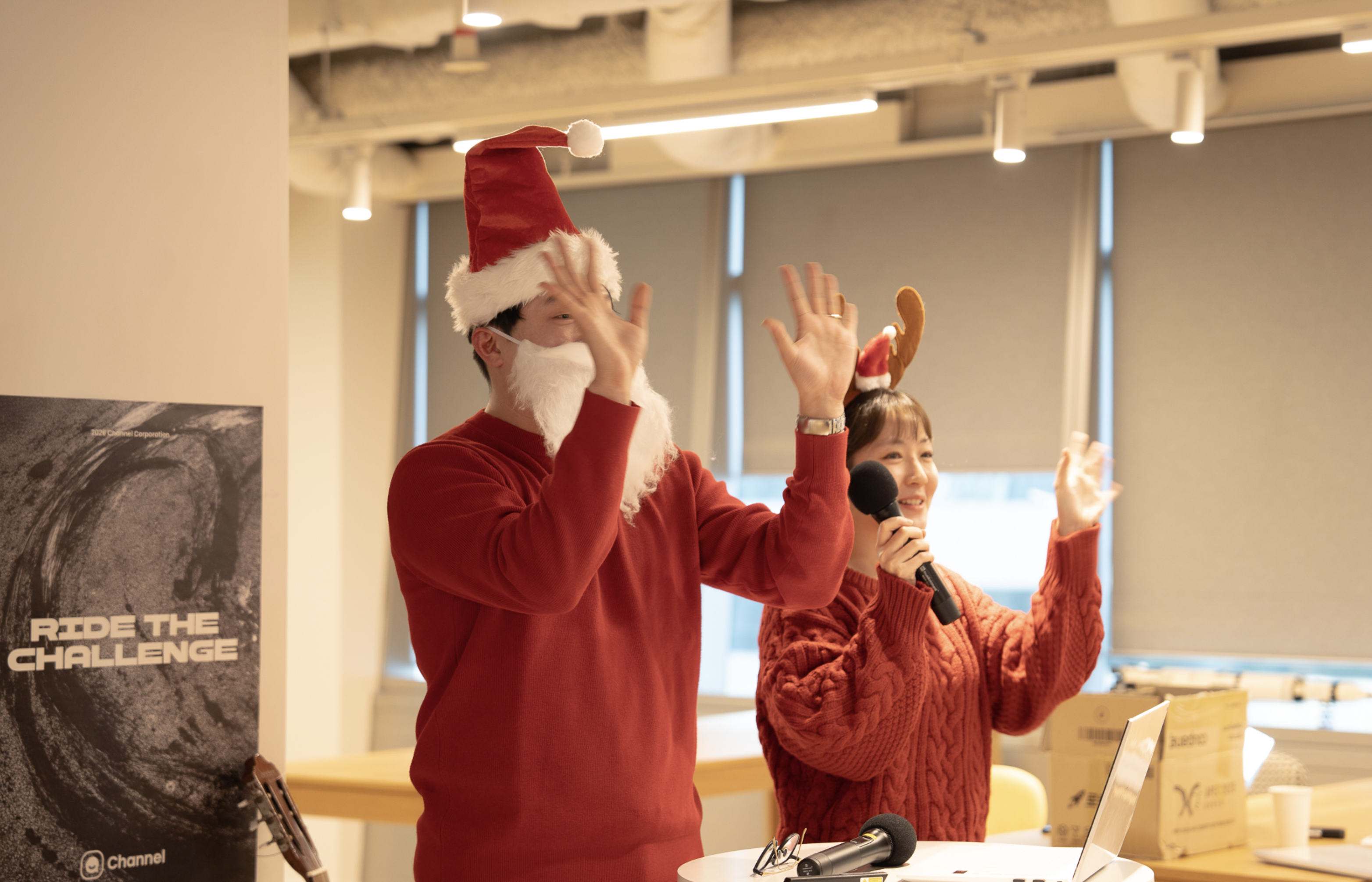 저는 채널팀의 인재밀도를 강화하고 멤버에게 감동을 주는 일을 하고 있어요. 지난 2025년 크리스마스이브에 채널팀 멤버가 모두 모여 연말 타운홀을 진행했는데요. 저와 로니가 MC를 맡아 타운홀을 진행했어요.