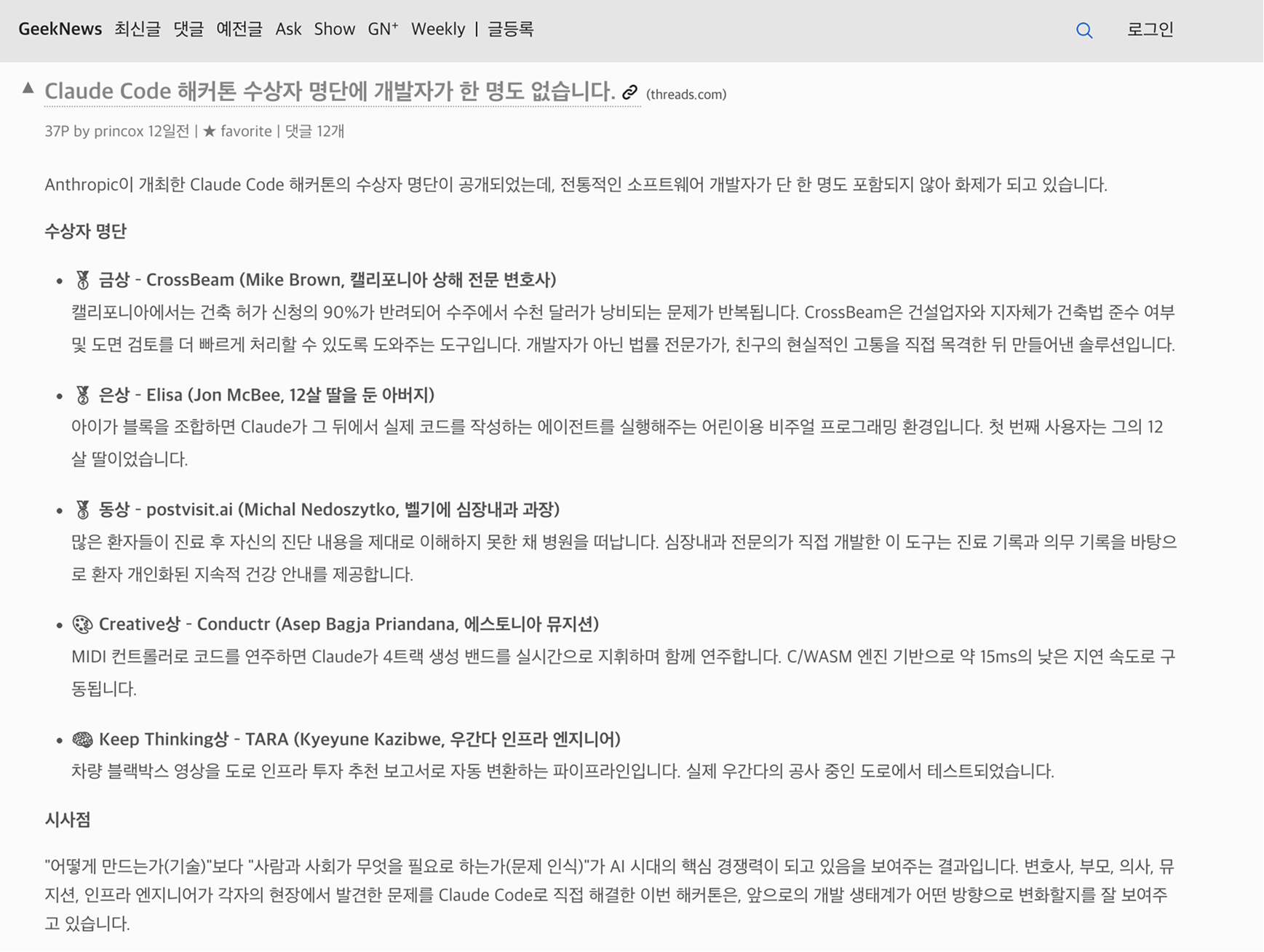 클로드 코드 해커톤의 주요 수상자에 개발자가 없습니다. 이제 어떻게 만드느냐 보다 어떤걸 만들어야하는지 문제를 발견하고 지시할 수 있는 사람이 중요한 역할을 맡게될거에요.