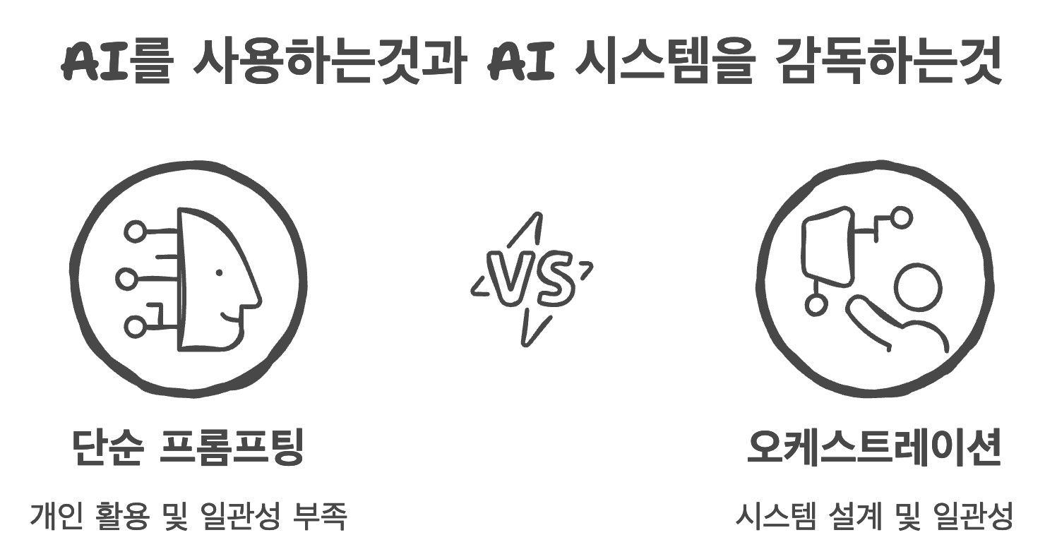 오케스트레이션은 여러 AI 모델과 툴을 연결하고, 프로세스를 정의하고, 원하는 결과가 일관되게 나오도록 시스템을 구성하는 것입니다. 예를 들어, 유저 인터뷰 녹취가 들어오면 → 자동으로 핵심 발화를 추출하고 → 기존 VoC 패턴과 비교해 → 발견된 문제를 정해진 포맷으로 정리하는 워크플로우를 구축할 수 있는가. 이것이 단순 프롬프팅과 오케스트레이션의 차이예요.