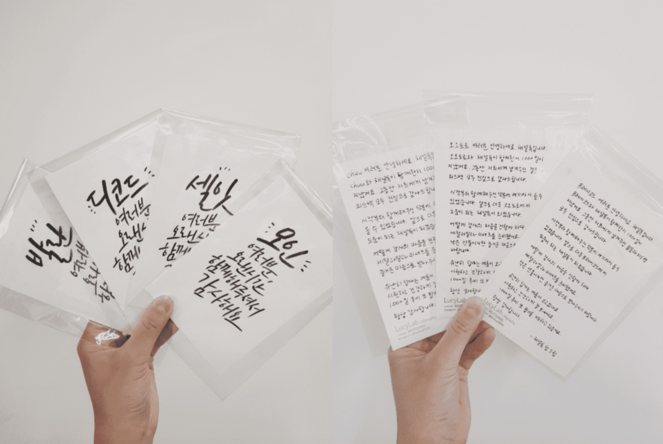 손편지 엽서입니다. 캘리그래피로 고객사 이름을 적고 뒷면에는 손편지를 적었습니다.