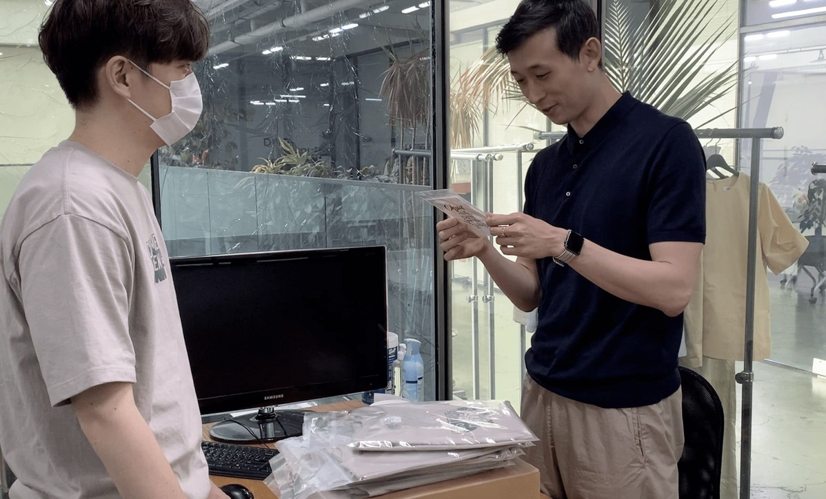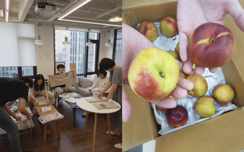 고객중심(Customer Driven)이 가슴에 적힌 티셔츠와 스티커를 포장합니다. 좋은 과일을 드리고 싶어 특별히 농사펀드의 과일들을 준비했습니다. (여름귤, 블루베리, 천도복숭아, 자두) 농사펀드는 장인정신을 갖고 농사짓는 농부들의 이야기와 퀼리티있는 먹거리를 제공하는 스타트업입니다.
