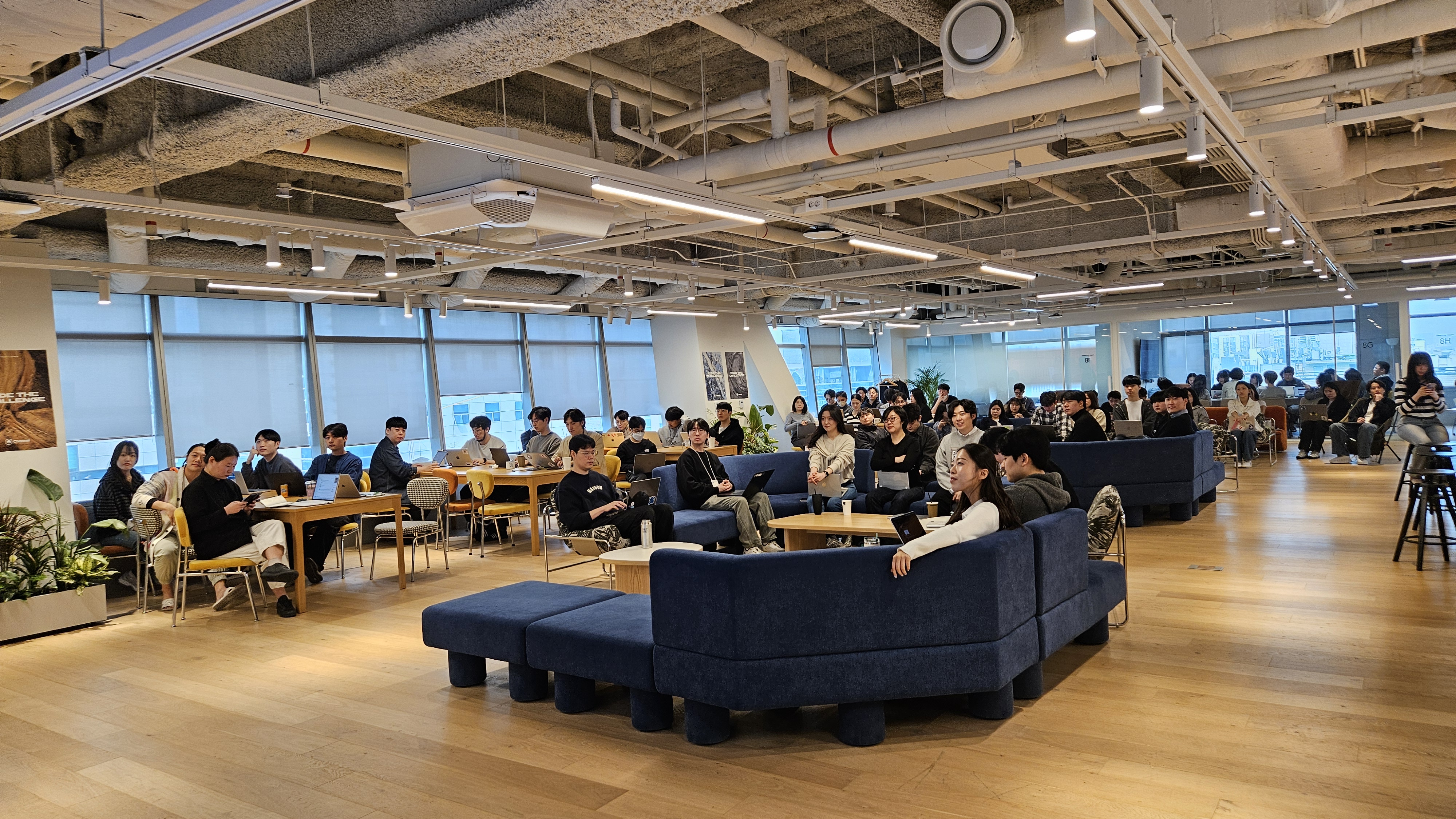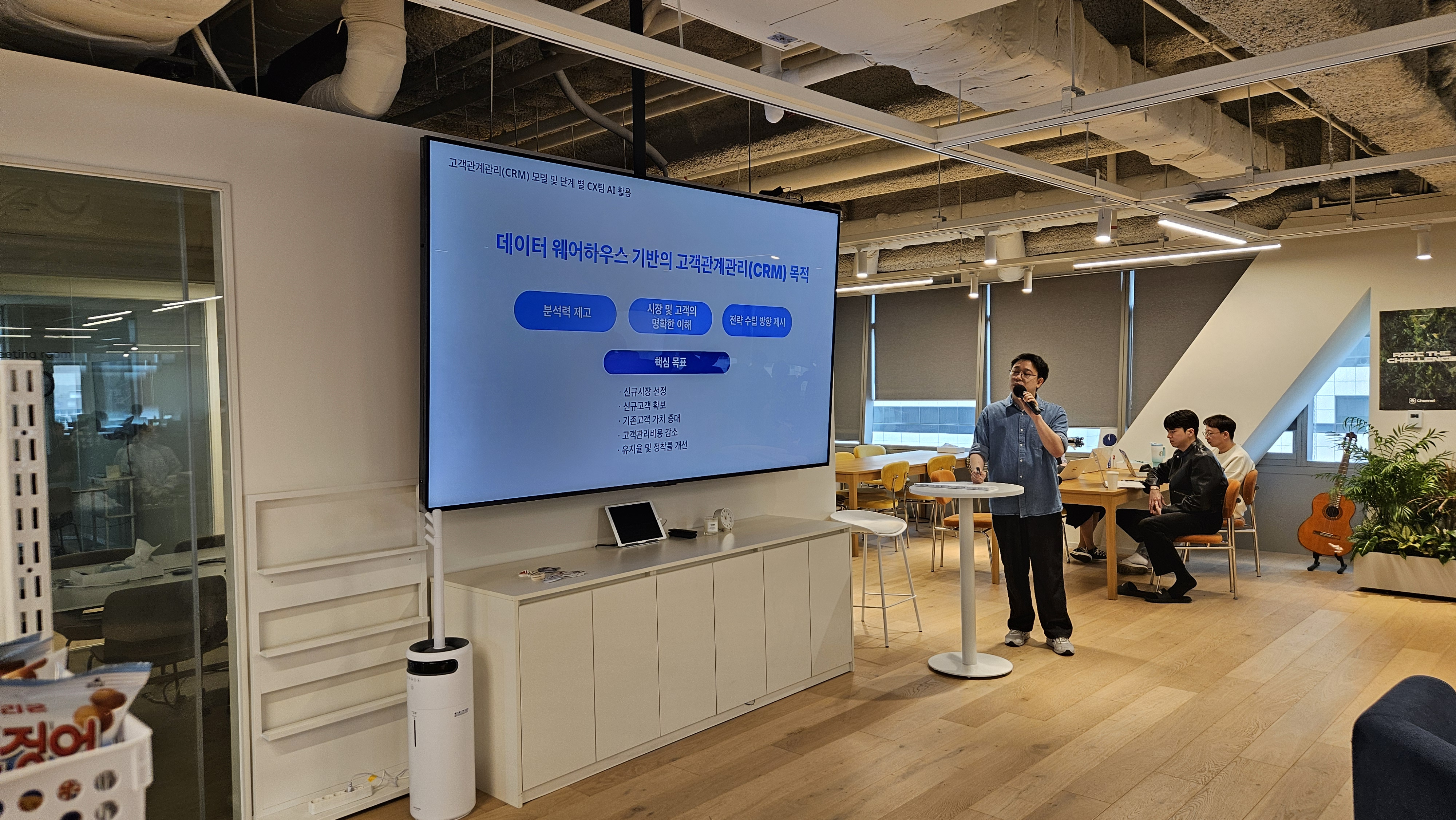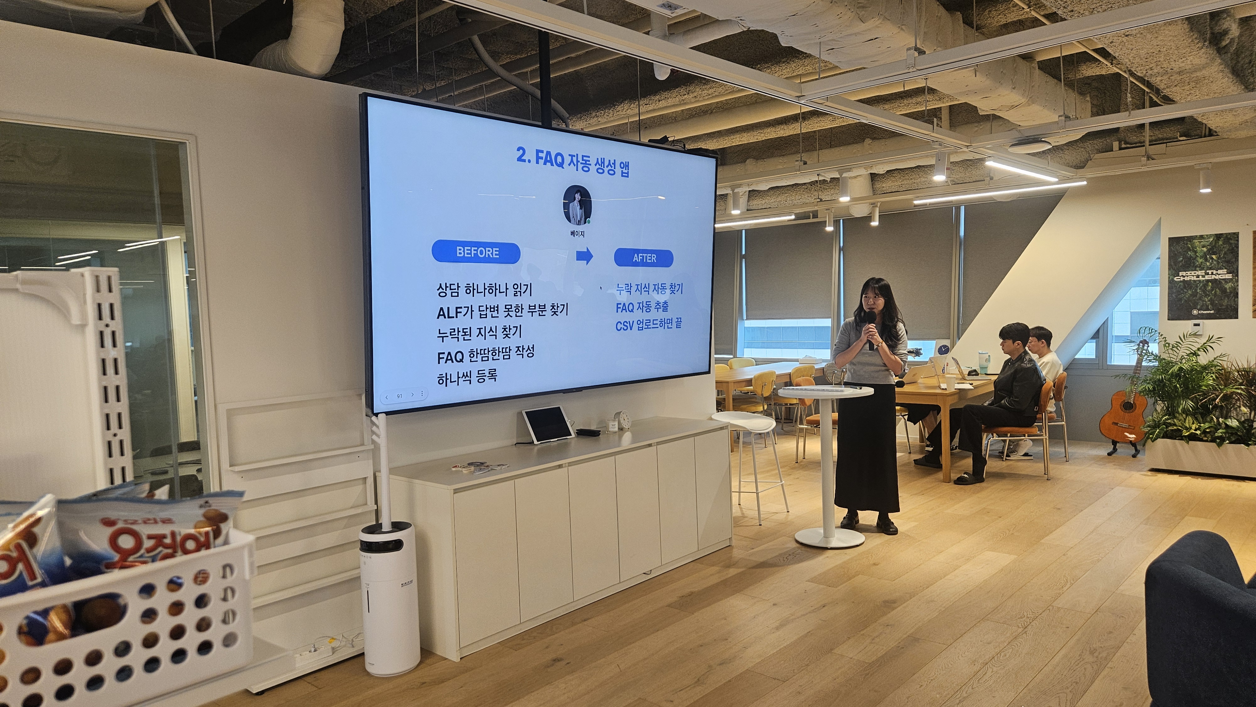 채널팀은 AI파도의 올라타서 도전의 나날을 보내고 있습니다. 매월 타운홀에서는 각 팀 별로 AI로 일하는 방식을 혁신하는 사례를 공유하는 문화가 자연스럽게 생겼습니다. 각 팀 별로 적극적으로 공유할 사례가 너무나 많아요. 그리고 더 소중한 것은 이런 세션들이 동료와 다른 팀에게 엄청난 자극을 주는 시간이라는 것이에요. 지난 3월 타운홀에서는 채널톡의 긍정적인 고객경험을 제공하는 CX팀에서 AX 혁신 사례를 공유해주었습니다. 이 순간만큼 멤버들이 정말 집중해서 들었어요. 타운홀이 끝나고 팀챗에서 CX팀의 사례를 공유해달라는 쓰레드가 빗발쳤습니다.