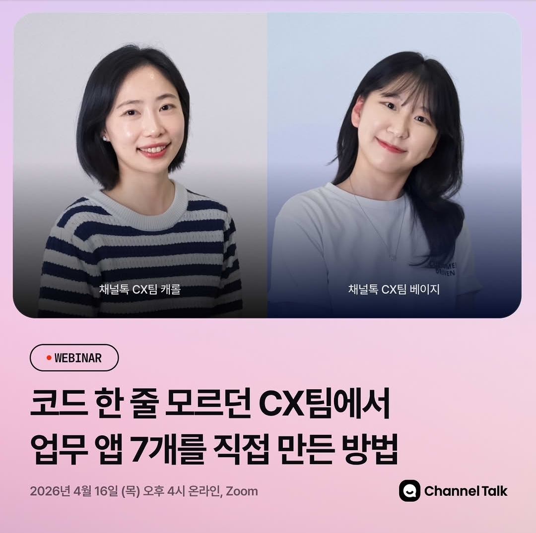 마침 4월 16일에 <CX팀이 AI로 성과를 만드는 방법> 웨비나가 진행됩니다. 내일 당장 우리 팀에 적용할 수 있는 진짜 현장의 AI이야기가 궁금하시다면, 신청해주세요.