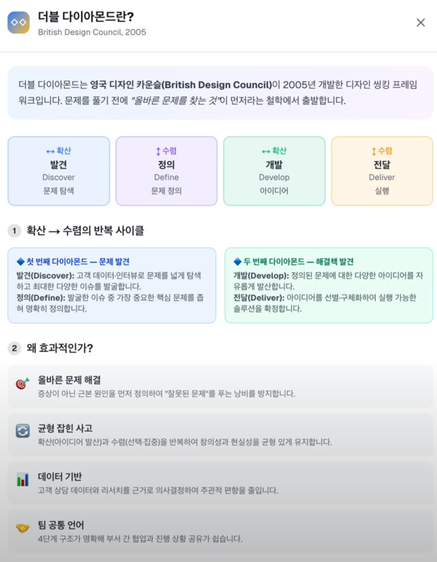 '더블 다이아몬드 프레임워크 앱'의 개발 목적은 올바른 문제를 찾아 제대로 해결하기 위함이었습니다. 데이터를 정밀하게 타겟팅하고, 단계 별로 적합한 기법을 선택하고, 자동분석 리포트까지 도출해줘요. 이를 통해 CX팀이 분석에 쏟던 에너지를 실제 문제해결(실행)에 더 많이 집중할 수 있는 구조로 만들었습니다. 글로벌 기업에 걸맞게 영어와 일본어 기능도 제공하며, 강조 기능 및 리포트의 이미지 저장 기능을 지원하여 유관 부서와의 리포트 공유가 용이합니다.