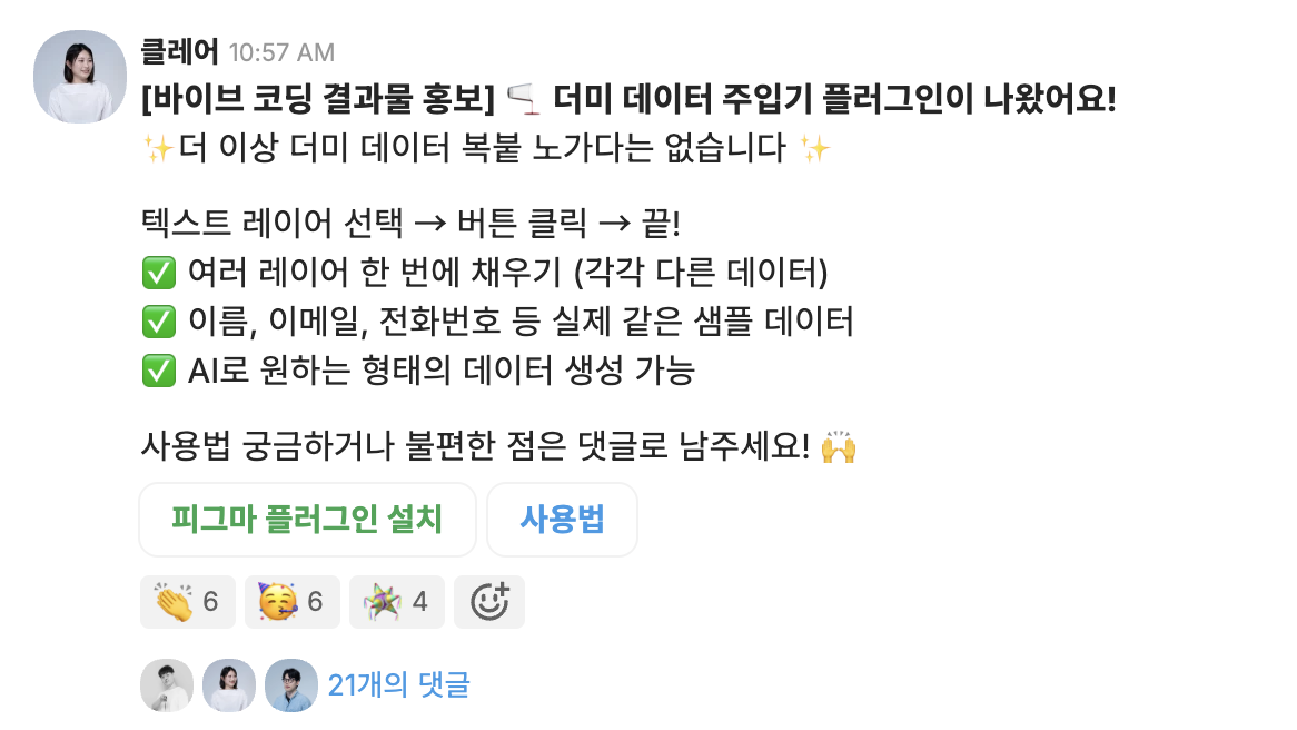 디자인을 하다 보면 사용 가이드, 업데이트 노트, 마케팅 소재 등에 들어갈 UI 예시를 만들어야 할 때가 많아요. 문제는 이 화면들에 그럴듯한 더미 데이터가 필요하다는 점이에요. "홍길동", "test@test.com" 같은 대충 만든 데이터는 화면 이해 시 몰입도를 떨어뜨리고, 그렇다고 매번 현실적인 데이터를 고민해서 만들자니 시간이 꽤 듭니다.