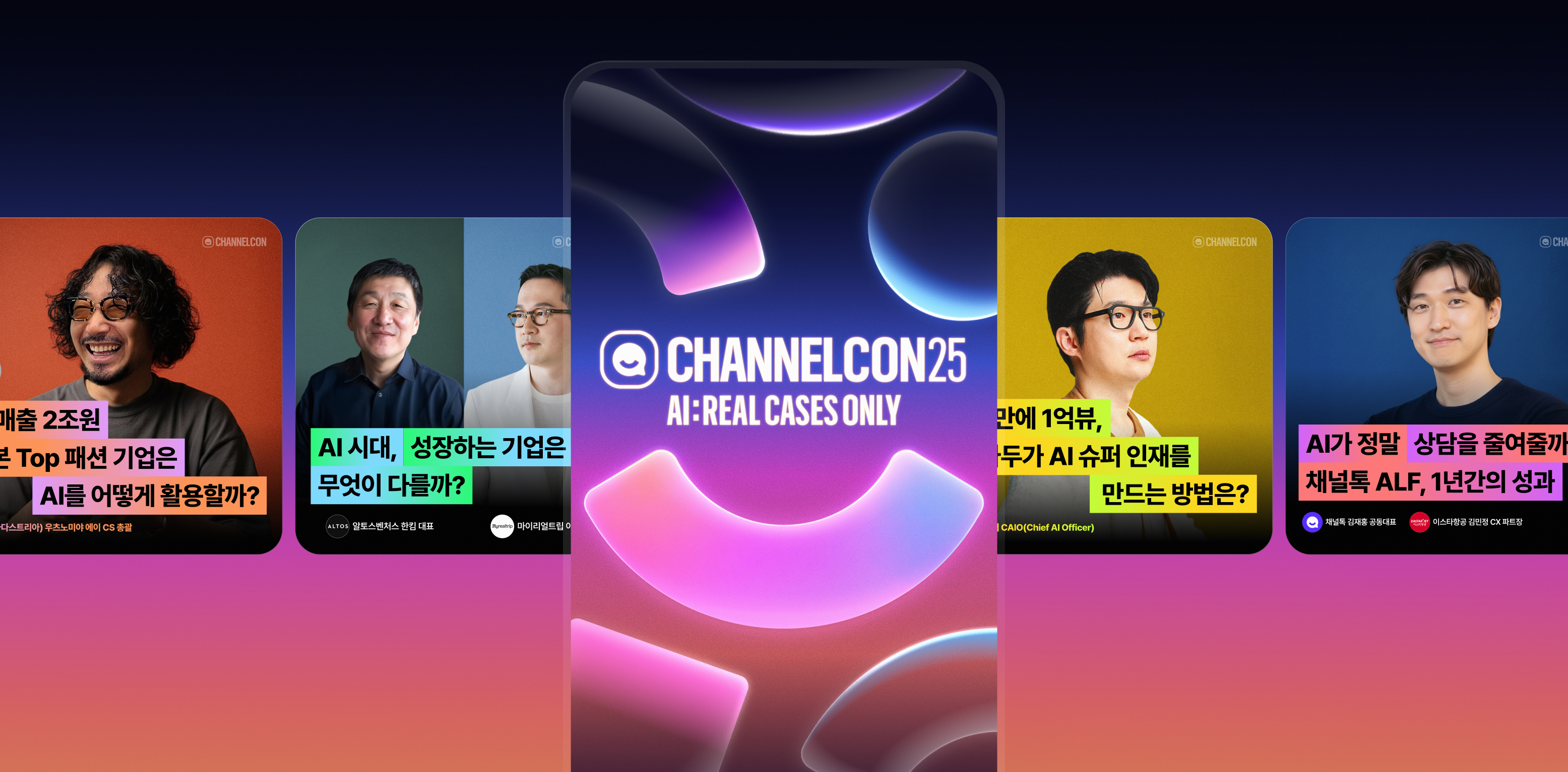 채널콘은 AI로 실질적인 성과를 만든 기업들의 이야기를 다루고 싶었어요. 공허한 허상이 아닌 실체있는 진짜 사례만을 찾아서 다루겠다는 의지. <AI: Real Cases Only>라는 테마에는 그런 의지가 담겨있어요.