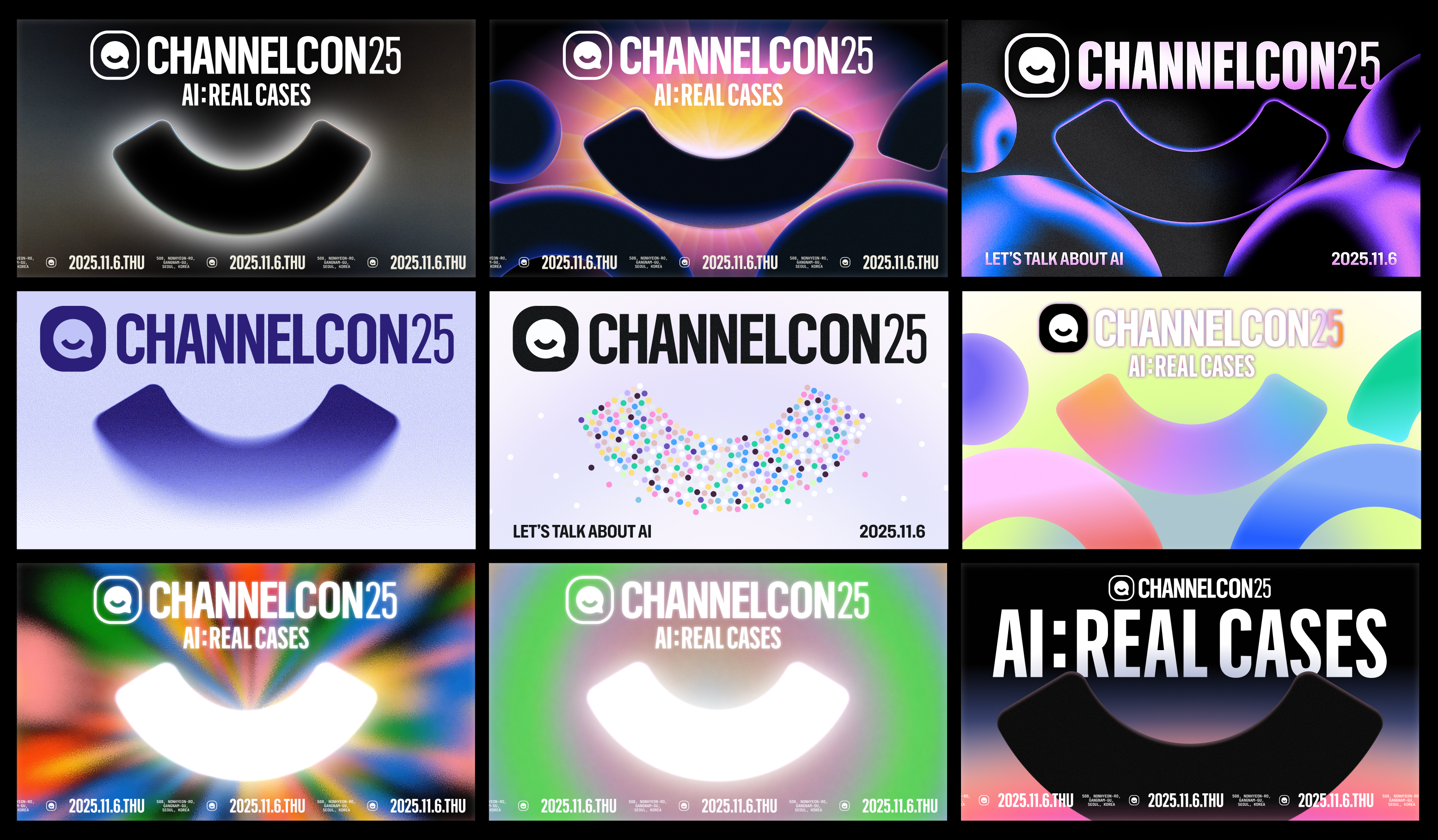 행사 아이덴티티는 채널톡의 기업 아이덴티티를 계승하면서도 살짝 새로운 느낌을 내려고 했어요. 행사 아이덴티티는 기존에 보여주지 못한, 채널톡의 다양한 얼굴을 보여줄 수 있는 기회니까요.