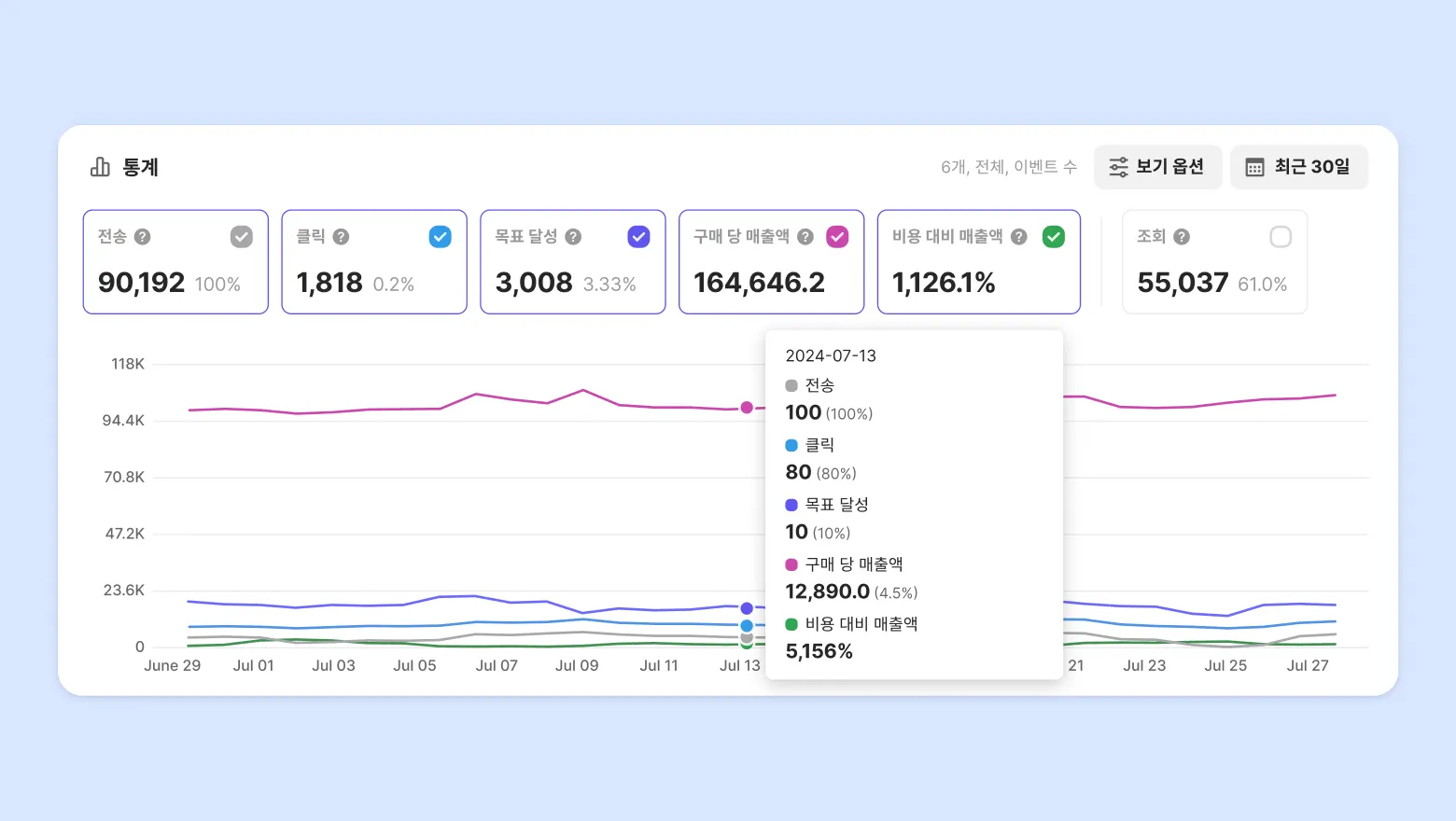 라이언: 경험 설계 측면에서는 저희 제품 기조 중 하나가 ‘확장성있는 공통 구조를 잘 설계하자’여서, 특정한 니즈에 맞추는 게 아니라 다양한 케이스에 적용 가능한 구조적인 UX가 필요해요. 그래서 전체 틀은 공유하면서도 개별 니즈를 쉽게 해결하는 UX/UI를 고민하는 데 많은 리소스를 쓰고 있습니다. 이 문제를 해결하기 위해 사용자에게 직접 피드백을 듣고 디자인 이터레이션을 돌아보기도 해요. 마케팅 통계를 만들 때도 그랬습니다.