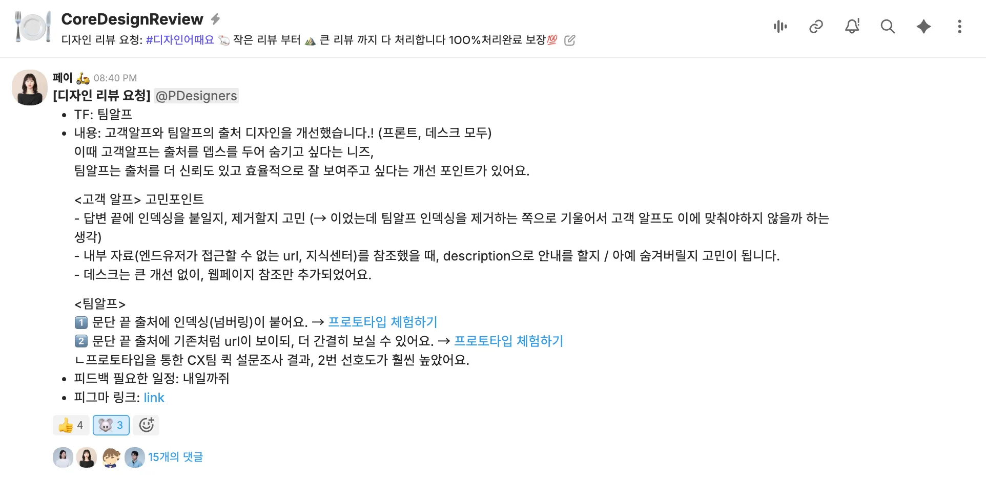 라이언: 자유롭게 상시적으로 작업 진행 상황을 공유하거나 디자인 리뷰를 요청하는 문화가 있어요. 엠케이가 말씀하신 것처럼 가볍게 리뷰를 요청하고 많은 피드백이 오가고 또 유연하게 받아들일 수 있는 분위기가 만들어져 있습니다. 사용성을 중심으로 피드백을 주고받기 때문에 자연스러운 합의가 잘 이루어지는 편이에요. 그리고 각 기능끼리 연관성이 있어서 더블체크가 필요한 부분들이 적시에 공유된다는 점도 장점이에요. 규모가 크거나 복잡도가 높은 기능은 매주 열리는 디자인 세션에서 좀더 본격적으로 공유하기도 합니다.