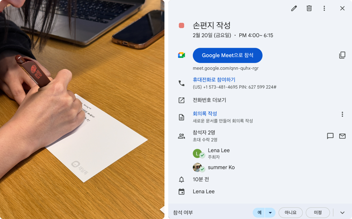 최종적인 콘텐츠 검수를 마치고 인쇄 발주를 넣은 밤, 침대에 누웠는데 잠이 안 왔습니다. ‘성과 안 나오면 어떡하지’ 하는 마케터의 고질적인 걱정이 시작된 건데요. 그때 머릿속을 스친 한 가지 아이디어! 바로 손 편지였습니다. 다음 날 아침, 함께 캠페인을 준비하는 동료 썸머에게 “미친 생각이지만 손 편지를 쓰면 어때요?”라고 제안했죠. 썸머의 답변은 “헐, 저도 그 생각했는데”였습니다. 채널팀은 ‘일이 되게 만드는 데’ 미친 사람들이 모였구나 싶었습니다.