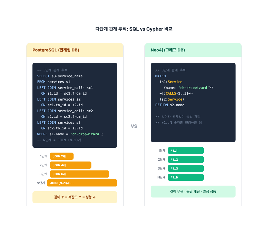 [:CALLS_API*1..3]이 바로 멀티홉의 핵심입니다. 이 패턴 하나로 1단계부터 3단계까지의 모든 간접 호출 체인을 한 번에 탐색합니다. 관계형 DB였다면 각 단계마다 JOIN을 추가해야 했을 것이지만, 그래프 DB에서는 *1..3 숫자만 바꾸면 됩니다.