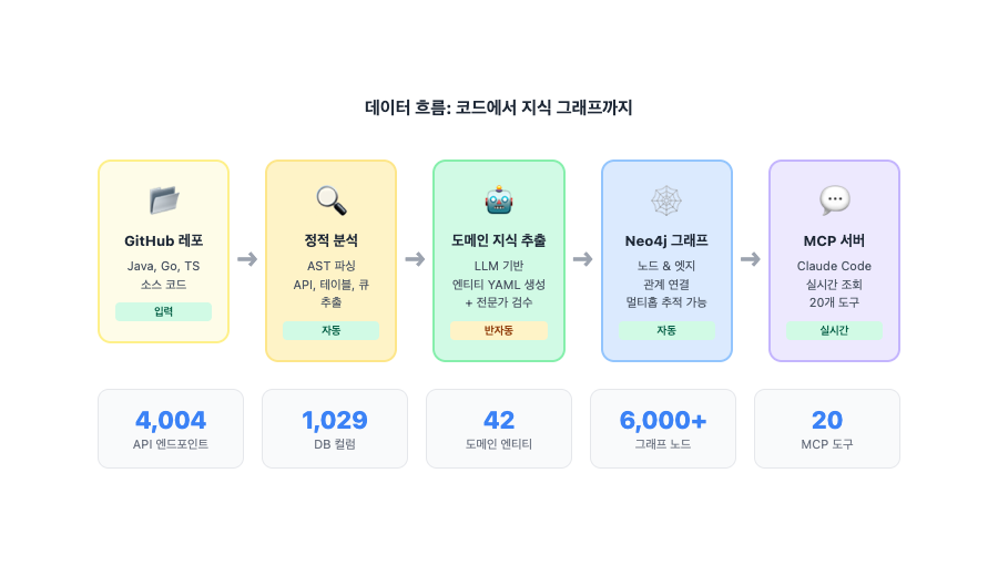 Layer 1 — 코드 분석: GitHub의 마이크로서비스 코드를 자동으로 파싱하여 API, 테이블, 큐, 이벤트 등 구조 정보를 추출합니다.