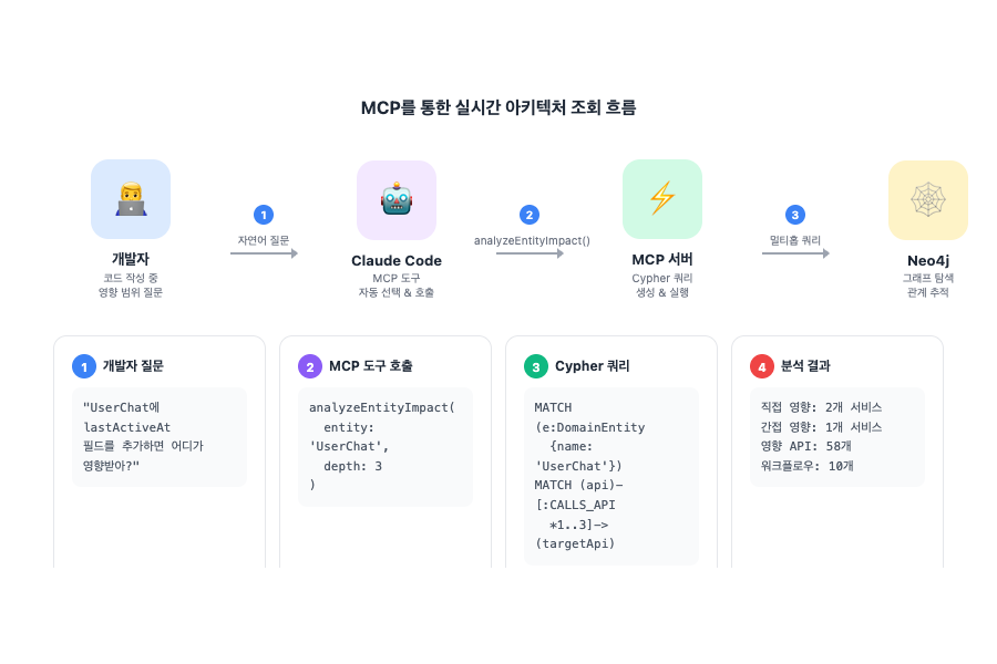 이 도구들 덕분에 개발자가 Claude Code에서 코드를 작성하는 중에 "이 엔티티를 수정하면 어디가 영향받아?"라고 물으면, MCP 도구가 자동으로 실행되어 Neo4j 그래프를 조회하고, 영향 범위를 즉시 보여줍니다.