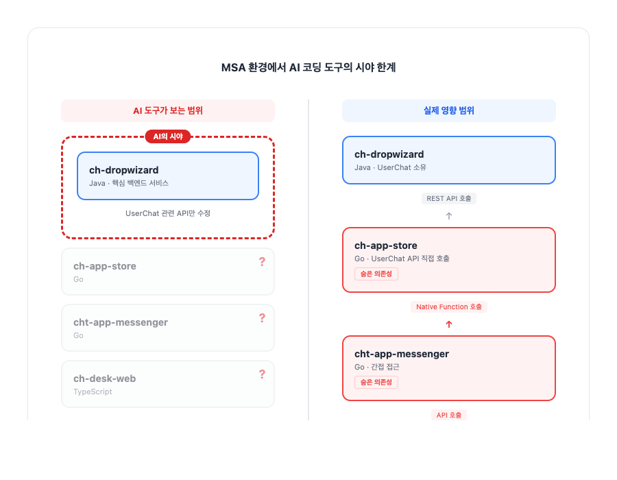 단일 레포만 보면 1개 서비스만 수정하면 될 것 같지만, 실제로는 3~4개 서비스에 영향이 갑니다. 이런 숨은 의존성을 모르고 코드를 배포하면 장애로 이어질 수 있습니다. 마치 Cursor나 Claude Code를 갖고 하나의 마이크로서비스 코드만 열어놓고 작업하면서, 다른 서비스는 전혀 보지 못하는 것과 같습니다.