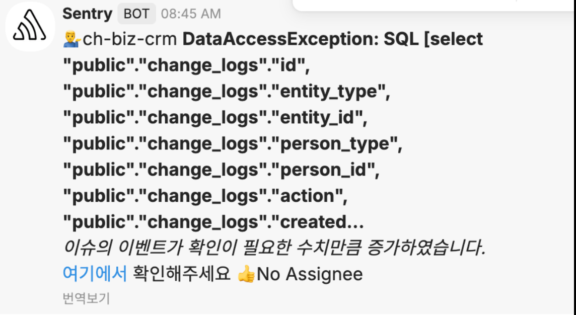 사용자 입장에서는 상담 시 "검색이 안 된다"는 경험이지만 내부에서 보면 쿼리가 인덱스를 타지 못하고 1000만건 이상의 테이블을 Full Table Scan을 하면서 6초 이상의 응답시간이 걸리는 문제가 있었습니다. 얼마 지나지 않아 Sentry에서도 알람이 울리기 시작했습니다.