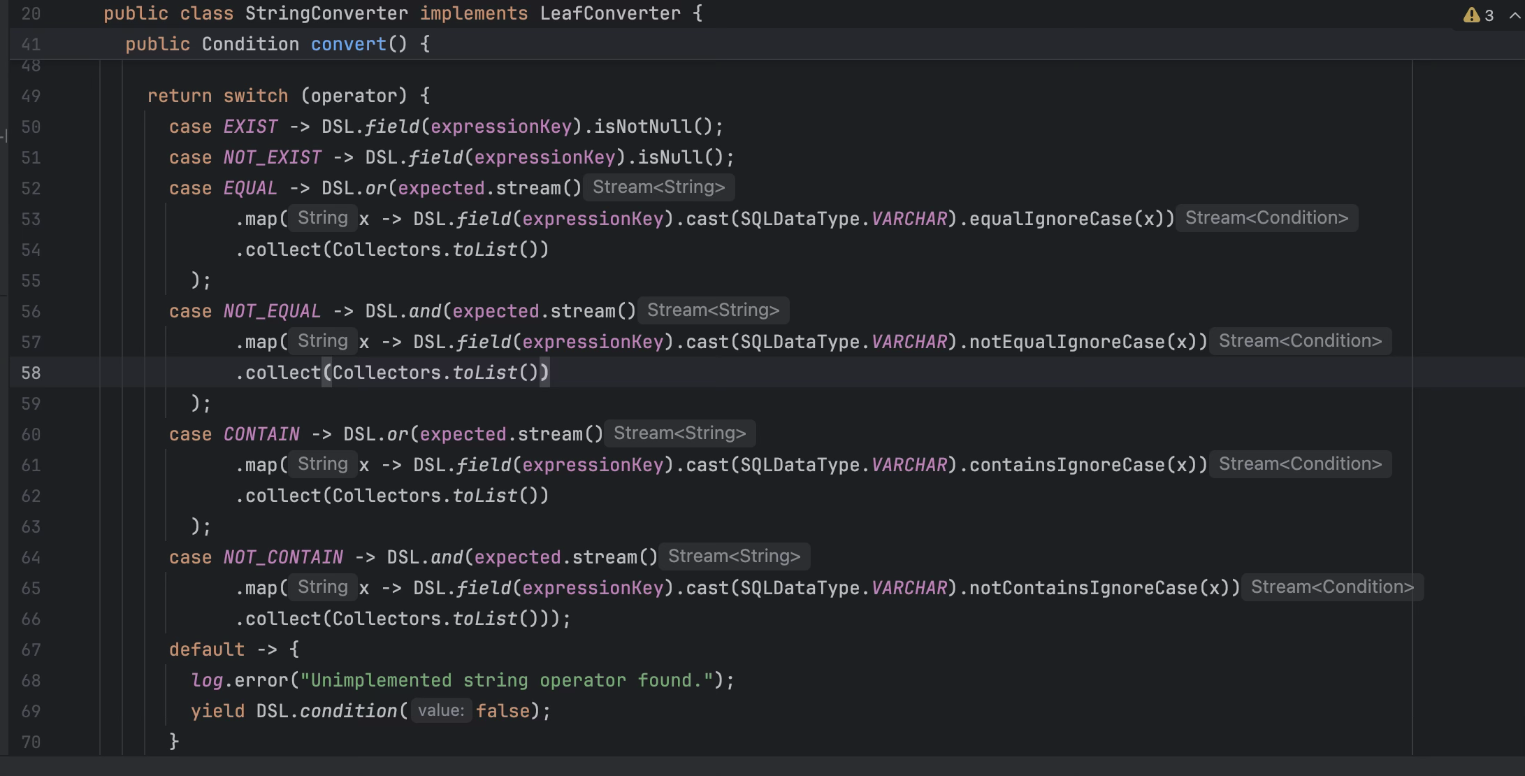 EQUAL, CONTAIN 등 모든 연산자에서 .cast(SQLDataType.VARCHAR).equalIgnoreCase(x), .containsIgnoreCase(x) 형태를 사용하고 있었습니다. 이 메서드들은 내부적으로 LOWER(col) 패턴을 생성하기 때문에, 아무리 쿼리를 잘 짜도 인덱스를 타지 못하는 구조가 되어 있었던 것입니다.