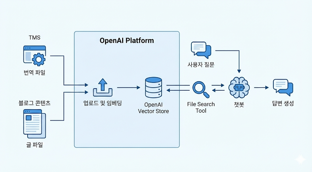 빠른 실험을 위해 OpenAI Agent Builder를 사용했어요. OpenAI를 선택한 이유는 Platform내에서 자체적으로 Vector Store를 제공하고, Agent Builder를 사용해 Chat UI와 File Search Tool을 원클릭으로 연동할 수 있었기 때문이에요.