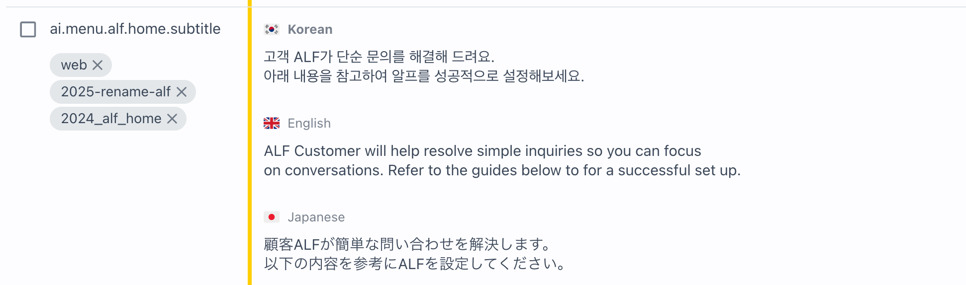 agent.conversation.closedTolgee에 들어 있는 번역 데이터는 단어와 용어 단위의 사전형 데이터예요. 그래서 정확한 표현을 찾아 재사용하는 데 적합했어요.