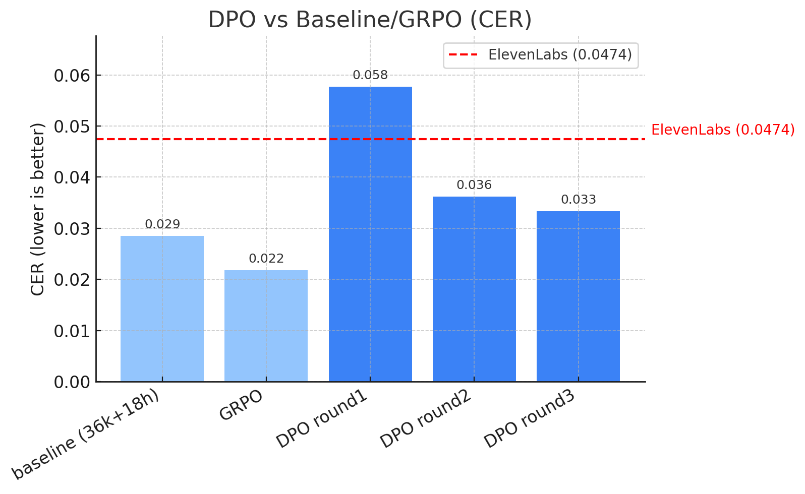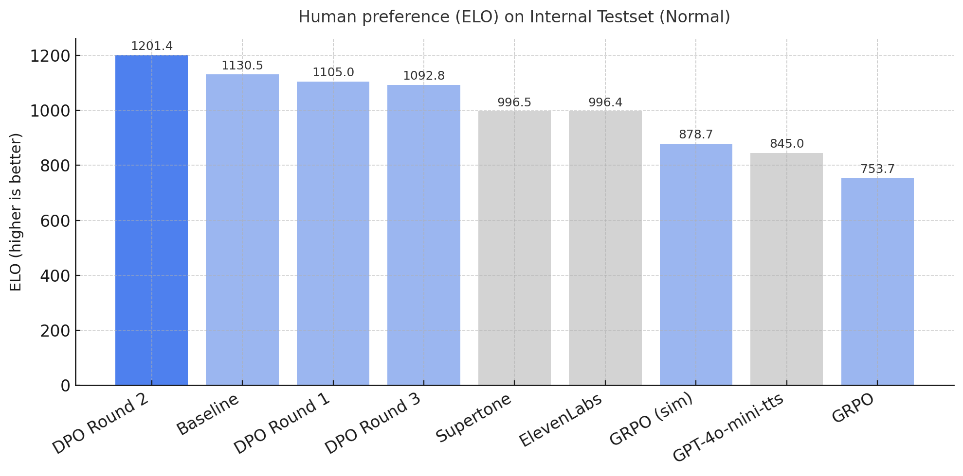 Fig1. 내부 벤치마크에서 A/B 테스트를 진행하였고 DPO Round 2 모델이 슈퍼톤, 일레븐랩스, GPT4o 등을 재치고 더 '상담사향에 적합하며' 사람같다라는 평가를 받았습니다.