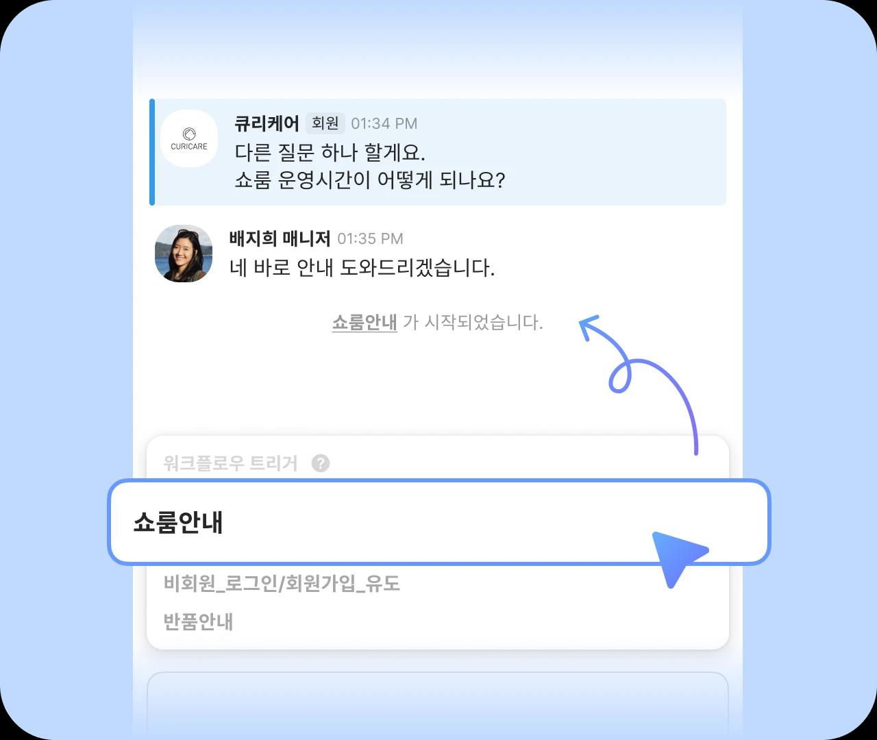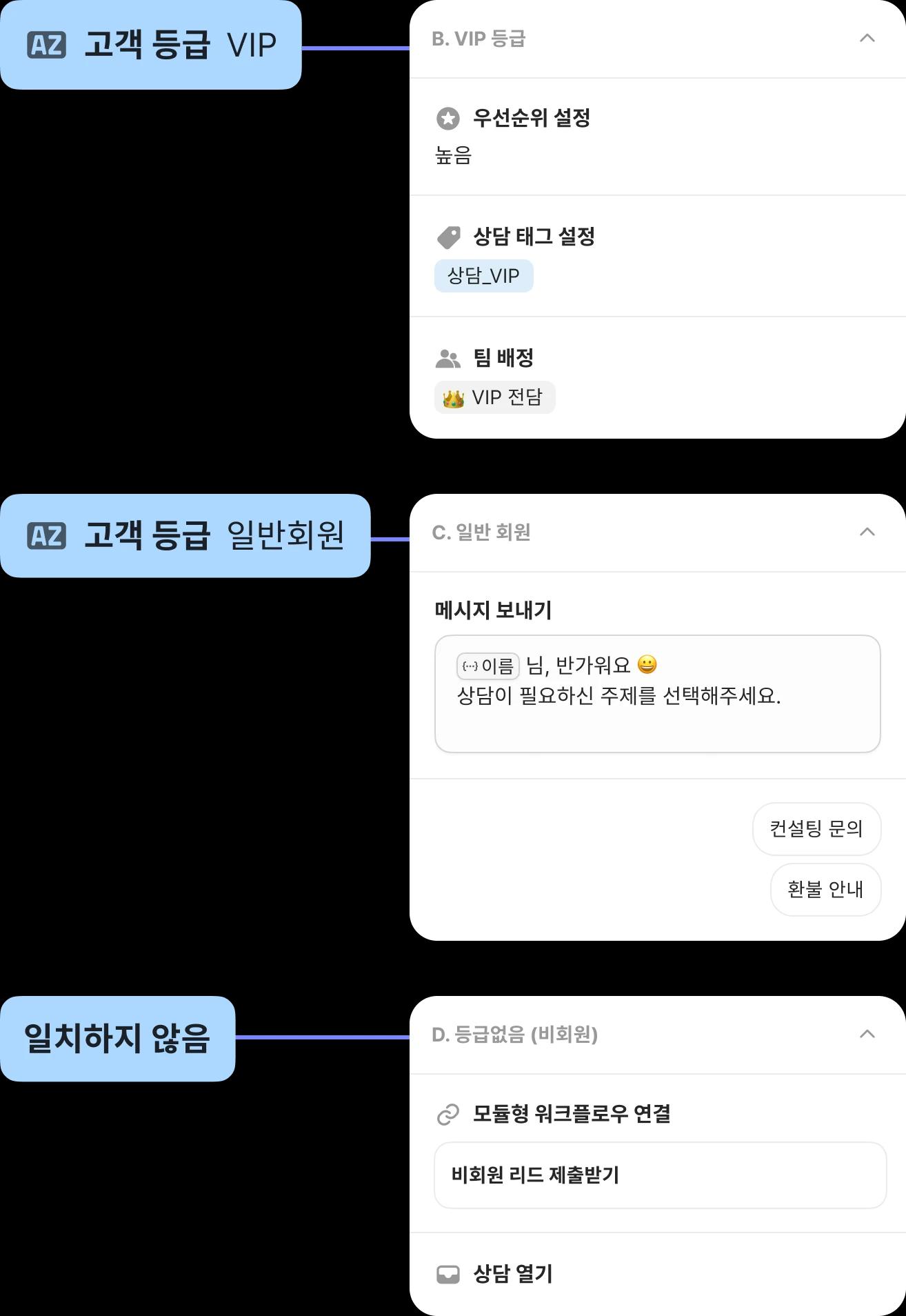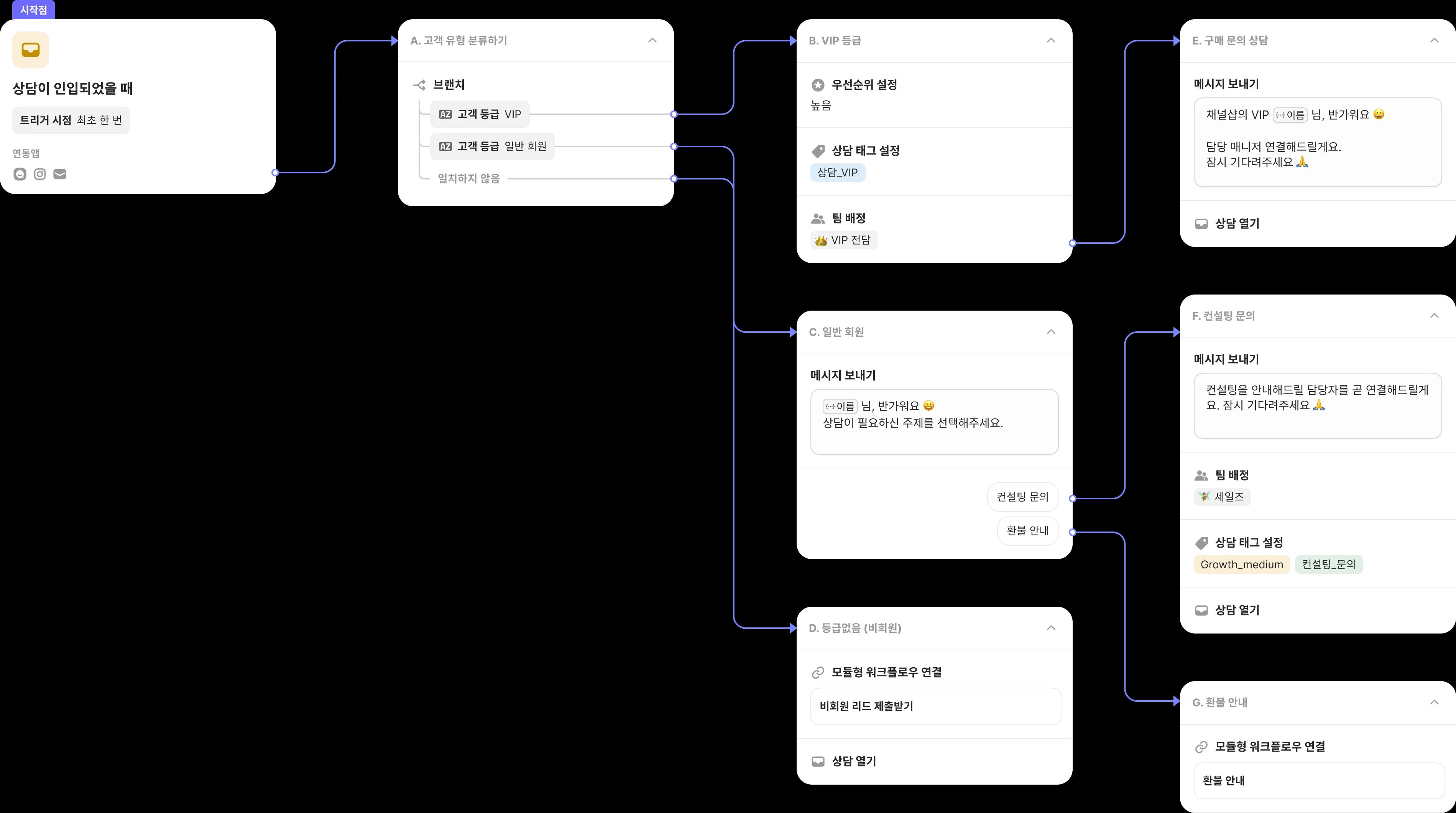 고객 등급, 문의 내용에 따라 적합한 담당자를 배정하거나 챗봇을 작동시키고, 태그를 붙일 수도 있어요.